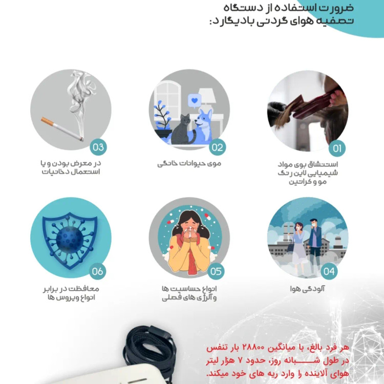 دستگاه تصفیه هوای گردنی محصول نوآورانه شرکت فناوری پزشکی کاویان گستر است که با استفاده از تکنولوژی یون منفی قادر به تصفیه هوا بدون نیاز به فیلتر میباشد. این دستگاه میتواند گرد و غبار، باکتری و سایر آلایندههای هوا را جذب کند.یونهای منفی تولید شده توسط این دستگاه قادرند ذرات میکروسکوپی PS کوچکتر را جذب کنند. این فناوری نوین در مقایسه با سیستمهای تصفیه هوای متداول که از فیلترهای فیزیکی استفاده میکنند، کارایی بالاتری در حذف آلایندههای هوا دارد.دستگاه تصفیه هوای گردنی آویزان طراحی منحصر به فردی دارد که امکان استفاده آسان و راحت در محیطهای مختلف را فراهم میآورد. این محصول نوآورانه پاسخی به نیاز روزافزون جوامع شهری برای داشتن هوایی پاک و سالم است