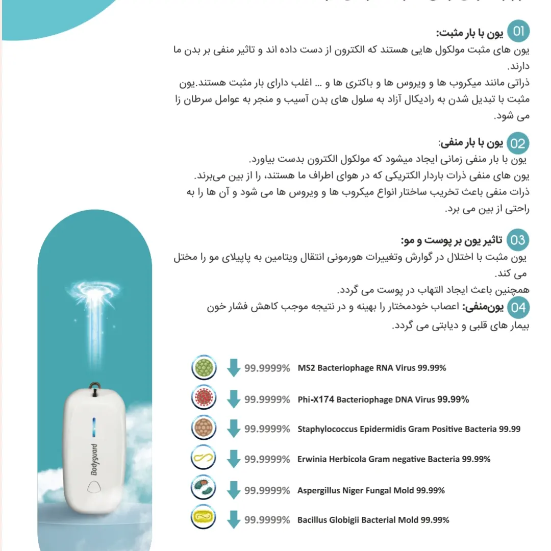 دستگاه تصفیه هوای گردنی محصول نوآورانه شرکت فناوری پزشکی کاویان گستر است که با استفاده از تکنولوژی یون منفی قادر به تصفیه هوا بدون نیاز به فیلتر میباشد. این دستگاه میتواند گرد و غبار، باکتری و سایر آلایندههای هوا را جذب کند.یونهای منفی تولید شده توسط این دستگاه قادرند ذرات میکروسکوپی PS کوچکتر را جذب کنند. این فناوری نوین در مقایسه با سیستمهای تصفیه هوای متداول که از فیلترهای فیزیکی استفاده میکنند، کارایی بالاتری در حذف آلایندههای هوا دارد.دستگاه تصفیه هوای گردنی آویزان طراحی منحصر به فردی دارد که امکان استفاده آسان و راحت در محیطهای مختلف را فراهم میآورد. این محصول نوآورانه پاسخی به نیاز روزافزون جوامع شهری برای داشتن هوایی پاک و سالم است